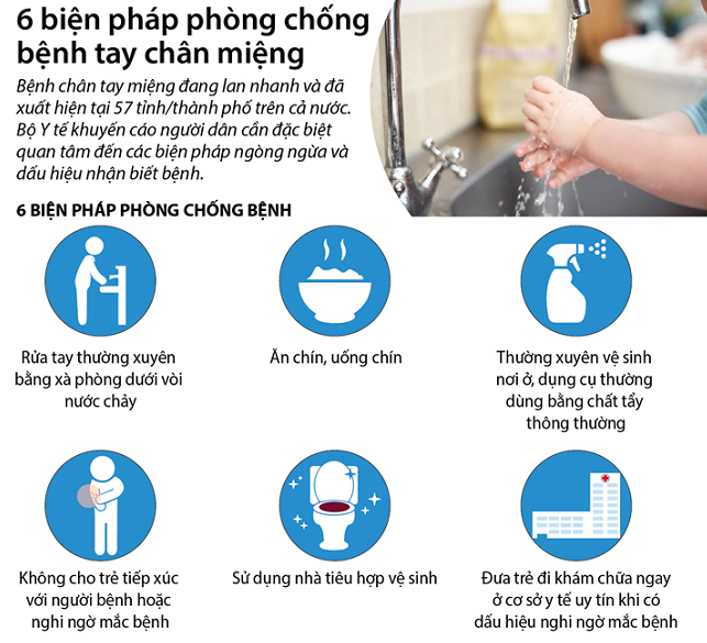 Rửa tay thường xuyên bằng xà phòng dưới vòi nước chảy nhiều lần trong ngày (cả người lớn và trẻ em), đặc biệt trước khi chế biến thức ăn, trước khi ăn/cho trẻ ăn, trước khi bế ẵm trẻ, sau khi đi vệ sinh, sau khi thay tã và làm vệ sinh cho trẻ.