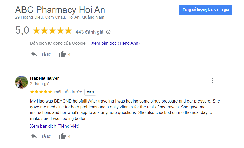 Our commitment to providing the best pharmacy services in Hoi An has earned us the trust and loyalty of many satisfied customers. As a leading drugstore in Hoi An, our dedication to excellence in healthcare is reflected in the positive feedback and recommendations we receive from those we've had the privilege to serve. Don't just take our word for it; you can verify our exceptional pharmacy service by checking out the numerous positive reviews on Google. We take great pride in the confidence our customers place in us as the go-to drugstore in Hoi An , and we strive to maintain the highest standards of care for your well-being.