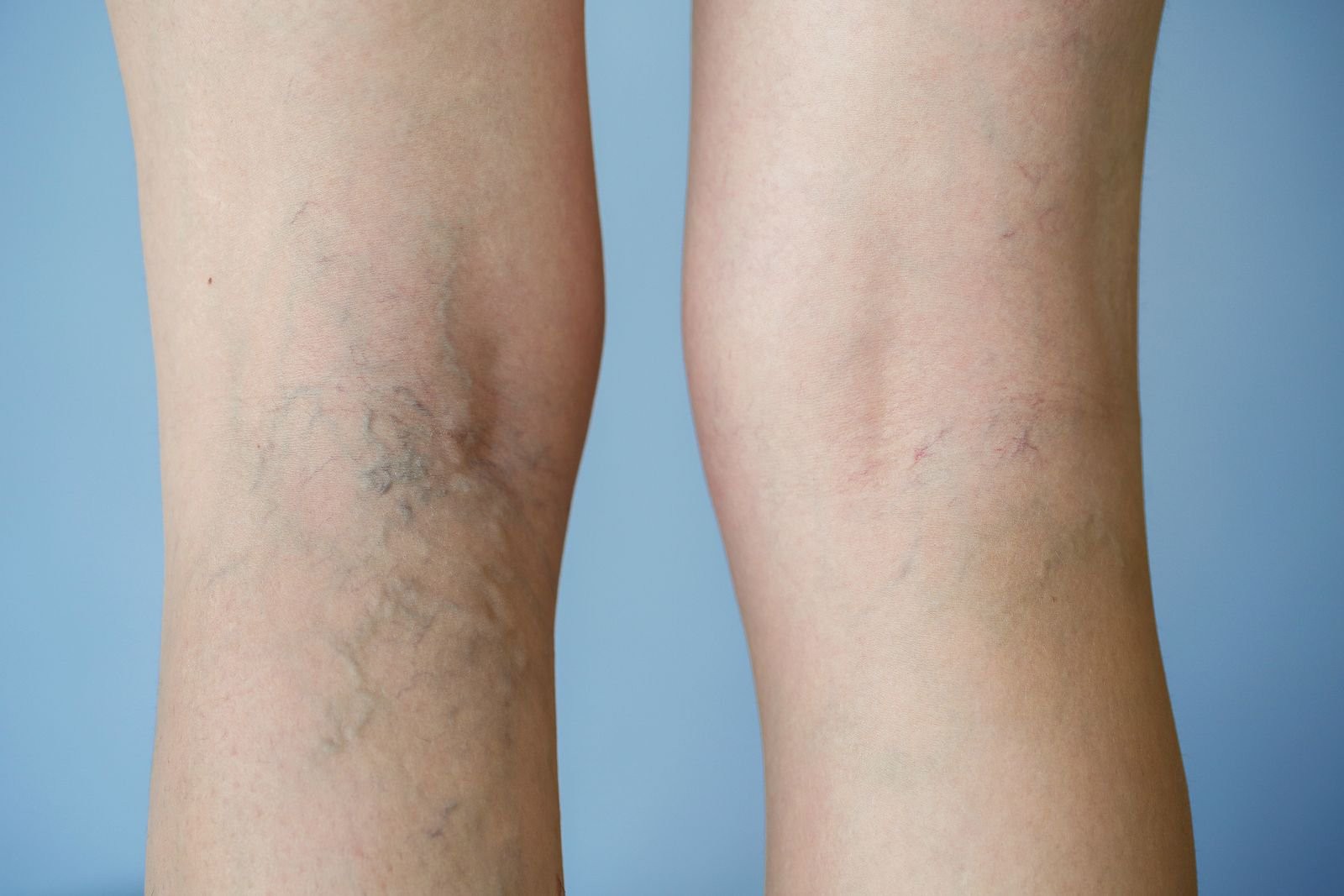 Tĩnh mạch xanh và nổi dọc theo đùi, mắt cá hoặc đầu gối; bằng mắt thường có thể nhìn thấy được;