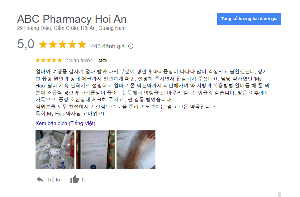 One day after using anti-inflammatory pain relievers and accompanying medications, creams and massage, her condition improved somewhat. She then left a positive review and included a thank you note to the ABC pharmacy Hoi An pharmacists.