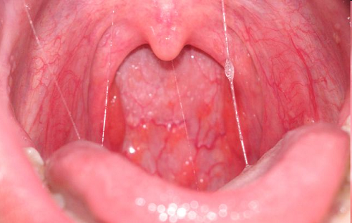 Niêm mạc họng đỏ rực. Màn hầu, trụ trước, trụ sau và thành sau họng phù nề, đỏ thẫm.