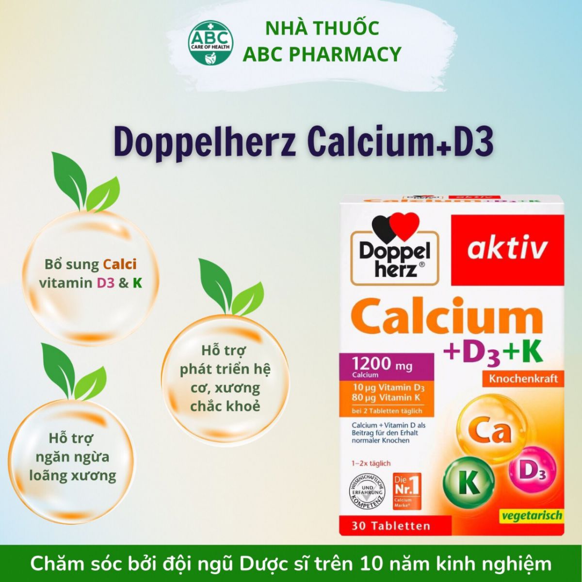 Viên uống Doppelherz Calcium D3 1200 là sản phẩm của Đức giúp bổ sung Canxi và D3 cho hệ cơ và xương khớp. Sản phẩm chứa 1200 mg canxi kết hợp với vitamin D và vitamin K – giúp canxi được hấp thụ tốt nhất cho cơ thể. Sử dụng sản phẩm hàng ngày giúp duy trì tốt hệ cơ, hệ xương.